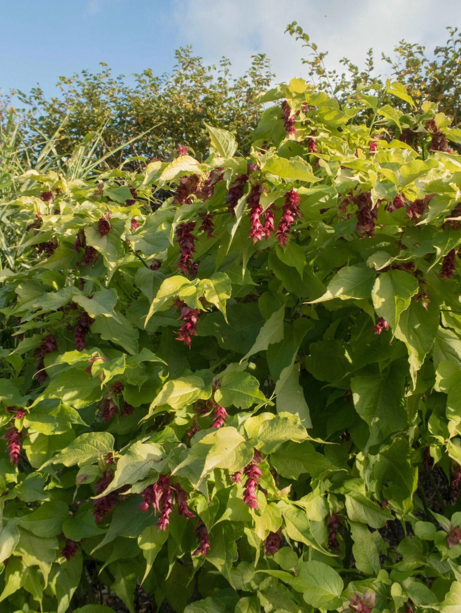 This stunning edible ornamental isĀ invaluableĀ as a strong upright accent in any mixed border or hedgerow. The golden/lime foliage pops in contrastĀ withĀ darker leaves, and its semi-evergreen nature makes it fascinating even during the cold winter months. Native to the lower altitudes in Tibet, this shrub is also called chocolate berry, due to the mild bitter chocolate/raisin flavor of its dusky fruit. Golden Lanterns has vivid, golden, heart-shaped leaves, with reddish new growth and pendulous white and burgundy-colored flowers. In the South it’s a beautiful year-round upright shrub to 6′ tall, but in the north it dies back to the ground each winter and re-sprouts. In late summer and early fall it producesĀ dozens of unique dangling clusters ofĀ rosy berries that turn a plummyĀ purple when ripe.
